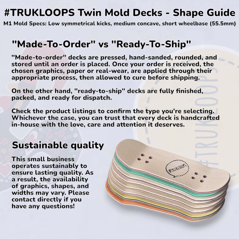 #TRUKLOOPS Twin Mold Decks feature low symmetrical kicks, medium concave, and a short 55.5mm wheelbase.
